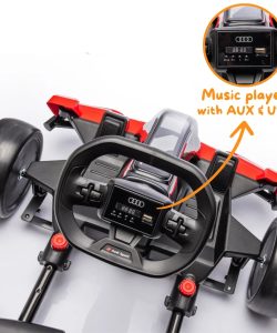 Safety comes first. The Audi Go-Kart is equipped with seat belts, allowing you to relax while your child races around. Its two powerful motors provide a smooth ride, and the built-in MP3 player with AUX and USB ports lets them race to their favorite tunes.
